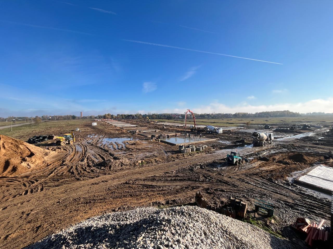 На фото — первые контуры будущего квартала: выстроенные фундаменты и поднимающиеся стены домов формируют очертания главной улицы.