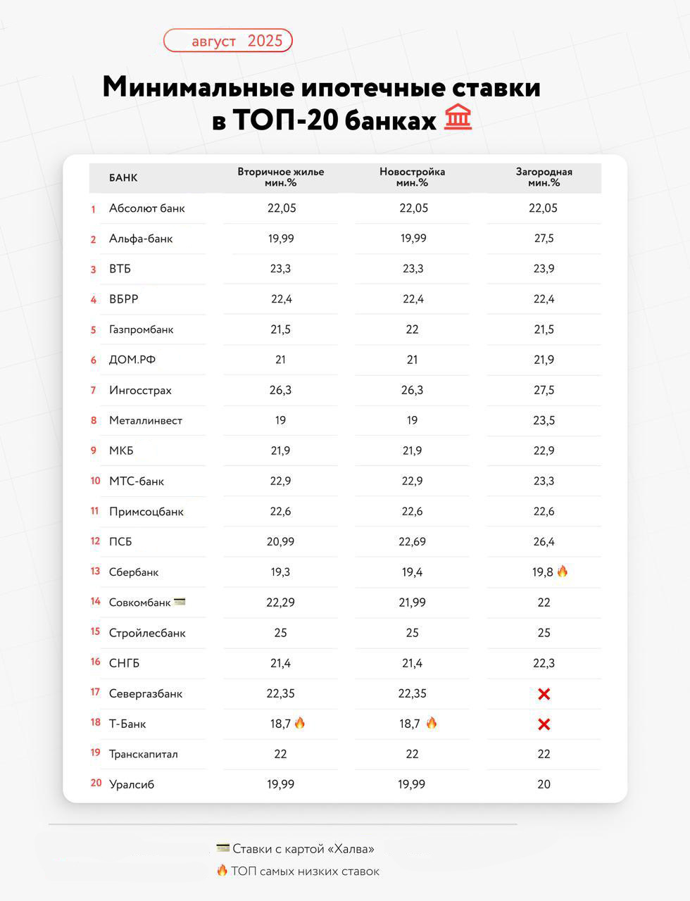 - 🌳 ИЖС (коттеджи и загородная недвижимость): от 19,8% годовых (Сбербанк)